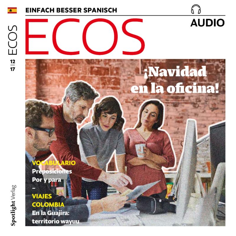 ECOS Spanisch lernen Audio kümmert sich gemäß der Jahreszeit um die Weihnachtszeit im Büro. Tratsch und Klatsch in der Arbeit vor und nach Weihnachten, wie immer mit Dialogen und Wortschatz rund ums Wichteln und die Besorgung von Geschenken.