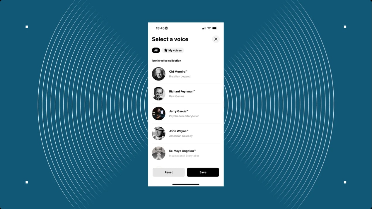At the bottom of the screen, tap on ‘Voices’ to choose from multiple options. You can even listen to famous voices in the ‘Iconic Voices’ section. Sample various options to find the one you like best.